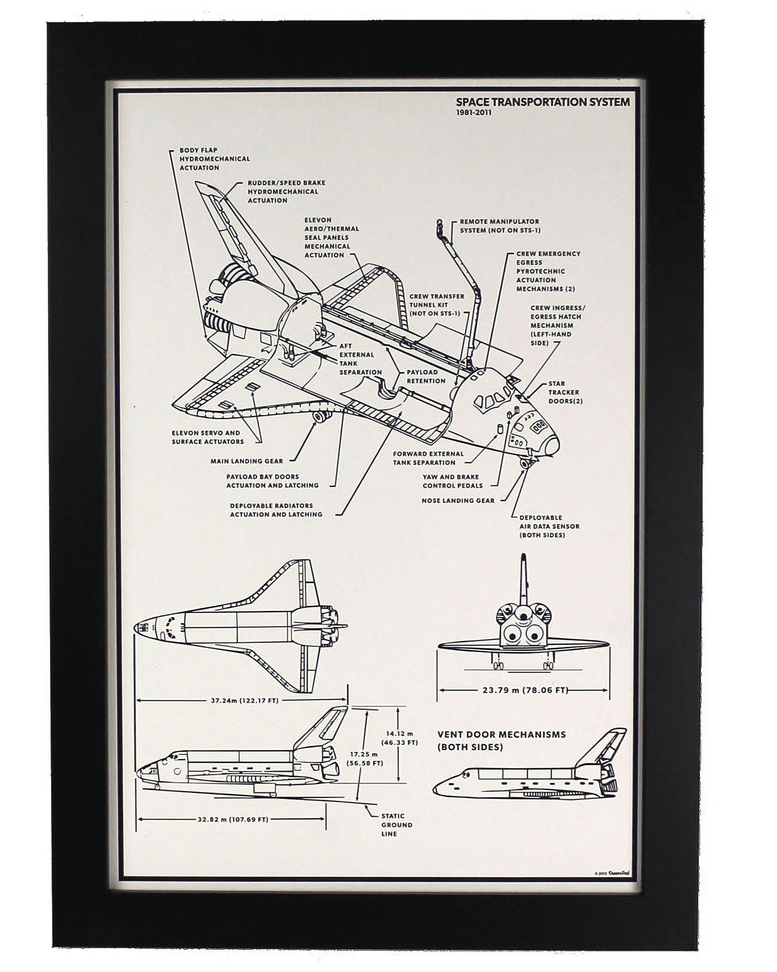 The Space Transportation System is better known by its moniker the "Space Shuttle". Launched - literally - in 1981, the Space Shuttles completed 135 missions before being retired in 2011. A workhorse of modern aviation, the Space Shuttle is beautifully designed, and a major piece of American history. This art print is an homage to the Space Shuttle and the crews that manned them. On this art, key pieces of the external orbiter have been labeled. The design is entirely designed and made in the USA. The design is printed on Royal Sundance Felt Finish 100% recycled 100 lb cover paper. It is certified by The Forest Stewardship Council and made with 100% renewable green electricity, green seal certified and chlorine free. The paper has a nice dimpled feel to it.
